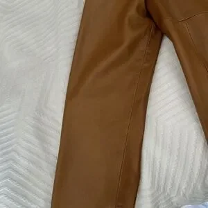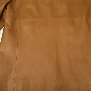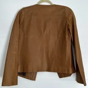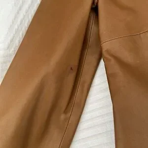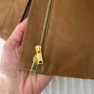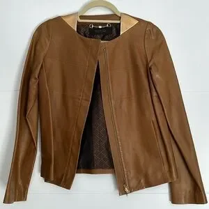 This Gucci leather jacket is super soft and smooth. It’s a rich caramel brown color with aged golden bronze leather detail at the neck and gold zippers that open two ways. There is one red mark on the under part of the left arm but isn’t visible when wearing. There is also a small tear on the left neck area where the golden detail is. But also isn’t noticeable on. Price is reflective of those issues. Size EU38.