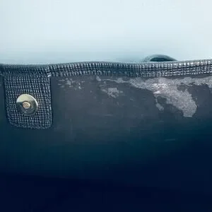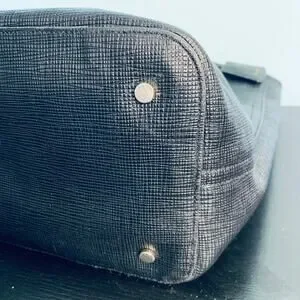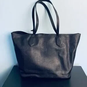 A classic black tote style bag that can be used as a purse, overnight bag or to carry laptops and other items to work! Two handles with a snap top closure. Roomy interior with a zipper and slide pocket. Some wear/discoloration on the inside of the lining, shown in photos. Exterior is in excellent used condition with just some light wear on the bottom corners.