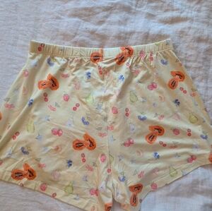 Charming cream shorts with vibrant fruit print. Features playful orange, pink, and blue accents. Comfortable and stylish for casual wear or stylish pajamas.