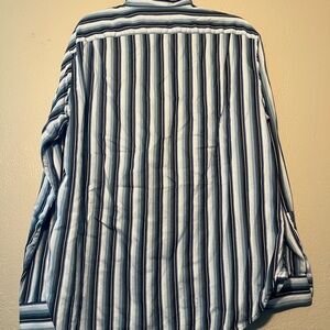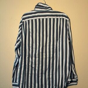 This casual button-down shirt from MICHAEL Michael Kors features a stylish blue and white striped pattern. Crafted for comfort and versatility, it's perfect for a relaxed yet polished look. The pointed collar and long sleeves add a touch of sophistication to this everyday essential. SZ L. Originally retails for $98