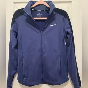 Excellent condition Women's Nike Dri Fit Running zip up jack. Pretty dark periwinkle blue color. Zip pockets on sides. Open pockets inside. Thumb hole on cuffs.