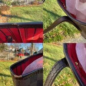 Exterior- vachetta top trim no cracks but multiple rubs as shown in photo