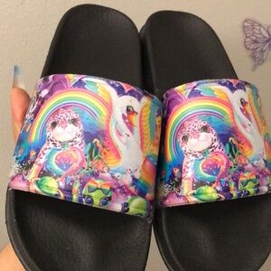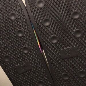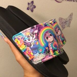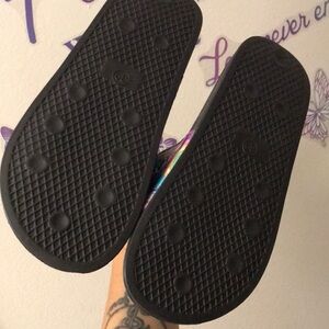 These sandals feature a striking combination of a colorful upper with a solid black sole, offering both style and comfort. The vibrant design on the upper part adds a playful touch, making them perfect for casual outings. With an open back, they are easy to slip on and off, ensuring convenience for everyday wear.