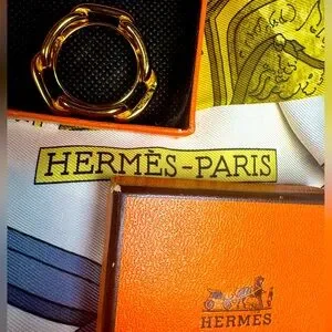 Hermès Chaine d’Ancre scarf ring gold anchor link vintage carré twilly accessory silk scarf hardware equestrian nautical hallmark French Paris luxury fashion rare discontinued collector statement jewelry boxed gift styling ring heritage item archive runway piece authentic 1990s 2000s