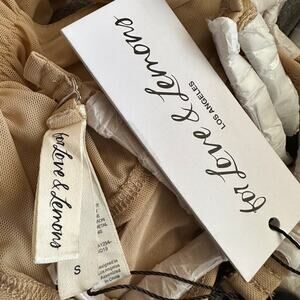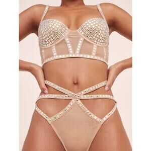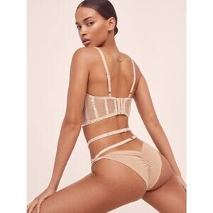 For Love and Lemons x Victoria's Secret Jackpot High Waist Panty in Nude. Size S / Small. Features high waist, cheeky silhouette, cut out features, stud jewel details throughout. 95% nylon, 5% spandex. Style SKPA1294. NWT / New with tags.