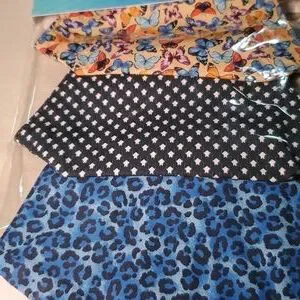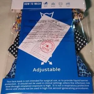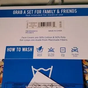 3 FACE COVERS. BREATHABLE MESH LINING WASHABLEWITH AN ADJUSTABLE FIT. FACE COVERS ARE 50% COTTON AND 50% POLYESTER. EAR LOOPS ARE CONSTRUCTED FROM MAN MADE FIBERS
