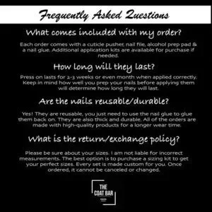 The Coat Bar nails are designed and hand-painted with layers of quality gel polish cured with UV/LED light.