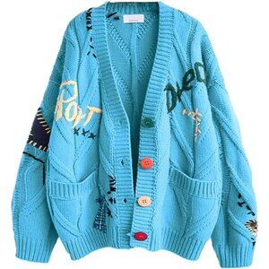 - Women's Casual Chunky Knit Letter pattern Cardigan Sweater Outwear Buttoned Slouchy Coat Cover Ups Tops Loose Coat with Pockets.