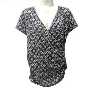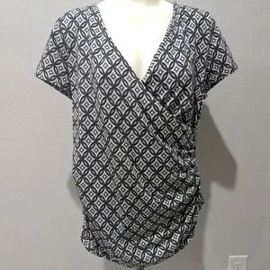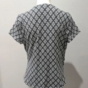 This Talbots blouse features a striking black and white geometric pattern with a wrap-style V-neckline, offering a relaxed and flattering fit. The short sleeves and lightweight fabric make it ideal for warm weather or layering. Its versatile design is perfect for both casual and dressy occasions.