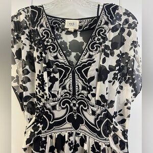 Like new condition, Beautiful black and white flower print maxi dress with separate black slit that goes underneath.