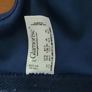 Stylish navy blue bra with pink polka dots. Features lace detailing. 34F