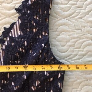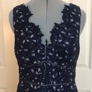 This elegant navy blue lace midi dress is perfect for any occasion, but was specifically designed to celebrate the 145th Kentucky Derby horse race. This sleeveless dress features a navy blue and white lining that shows through the navy blue floral lace over-dress. There is a back zipper closure.