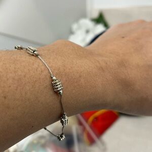This dainty vintage bracelet is a lovely find from my 24+ year old (well kept) estate collection, likely dating back to the 1980s or 1990s. It features a series of intricately textured barrel-shaped beads in a silver-tone finish with gold-tone accents, strung along a fine, light gray cord-like structure for a soft, flexible feel. The delicate yet durable design makes it a perfect piece for layering or wearing alone for a touch of understated elegance.