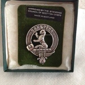 Pewter men or womens' kilt or brooch. Made in Scotland in 1992. Measure 3"long x 2-1/2" wide. On the badge is "SANS PEUR" which means "Without Fear" and is commonly associated with courage and bravery. The paper states Sutherland , but, it can be worn by anyone. Original box. Never worn.