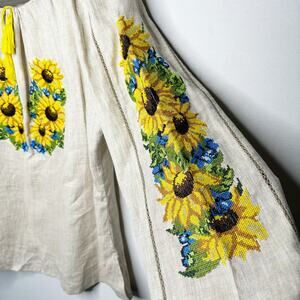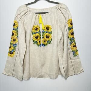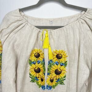 Needlepoint Yellow Sunflower Peasant Blouse Womens 46/XL Drawstring Neckline