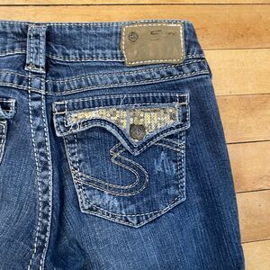 Silver Jeans Women’s Size 27/32 Suki Surplus Medium Wash Boot Cut Distressed