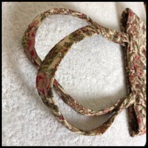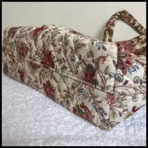 100% cotton. Cream burgundy & green floral print outside. Contrasting burgundy, cream, green trim and inside. Solid removable bottom. One inside pocket. Loop & button top closure. Very good pre-owned condition. See photos for details.