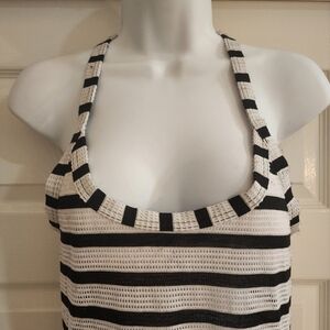 Pre-loved Spanx Beach Cover Dress. Size small with some stretch. Black and white stripes. Thick mesh type material with padded bra liner. Padding can be removed. Material is somewhat see through, so its definitely meant to be worn with a bathing suit or something under it. Racerback. High Low style. Polyester, spandex, and Lycra. RN# 112121. #2672.