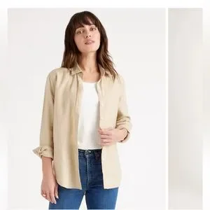 Really love this shirt but the color is just a little too cool-toned on me (it is less warm-toned than the Quince picture suggests). Smoke free home.