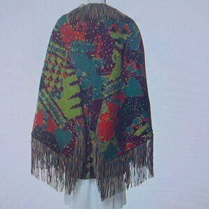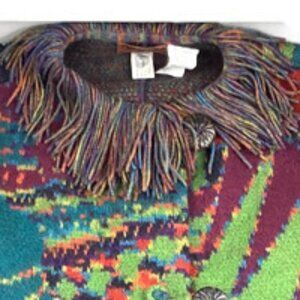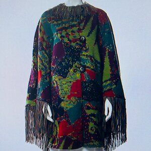 A stunning masterpiece, pictures don't do this justice. It's breathtaking with all the amazing, vibrant color contrasts and gorgeous fringe details. Amazing button details, batwing-like sleeves adorned with fringe on front and back. Two front pockets, thick and warm 100% wool. Made in Italy. In pristine condition, the only flaw is the fabric care tag has been unstitched on one corner.
