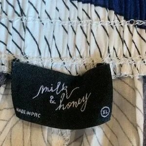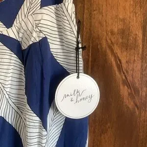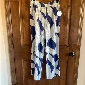 Stylish women's wide leg pants featuring a bold blue and white leaf print. Pull on style with smooth waist band in front and elastic in back; with pockets. Perfect for a chic and comfortable flowy look on the Beach or out for dinner. Measurements: waist lying flat: 17” plus elastic back; length 30”