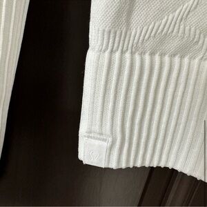 Elegant white sweater with a textured pattern. Features long sleeves and ribbed cuffs.