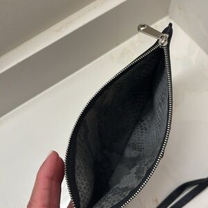 Henri Bendel RARE and retired. Small leather black pouch with long handle. Inside is suade leather snakeskin pattern in tones of gray. Closes with top zipper with insignia.