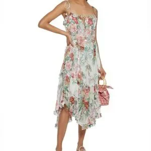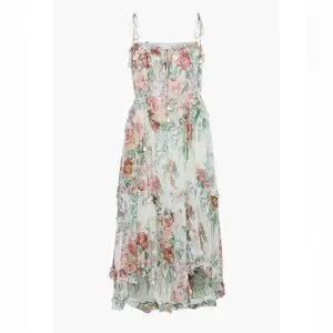 Charming floral midi dress with ruffle details. Features a mix of vibrant colors. Great condition. AU 1
