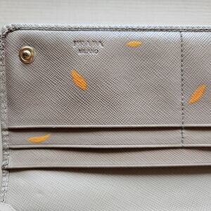 The Prada wallet is in good used condition, but had some marks and staining that couldn't be removed. It has been hand painted with a sunflower motif on the inner wallet, and touched up in various sections. It is not perfect, but in much better condition, and not greatly noticeable unless up close.
