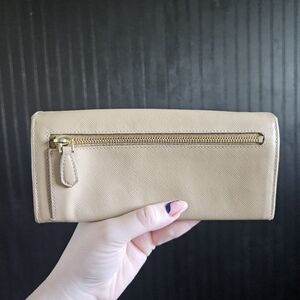 The zippers and snaps work just fine. A neutral tan color with gold hardware, it has 10 total card slots, and 2 zip sections, each clean & in good condition. The Prada logo on the front has had some fading of the gold. Generic D-rings and a chain have been added so it may be used as a crossbody as well.