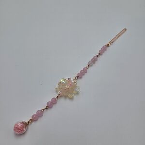 This stunning iridescent floral car charm features delicate pink beads, perfect for adding a touch of elegance to your car.
