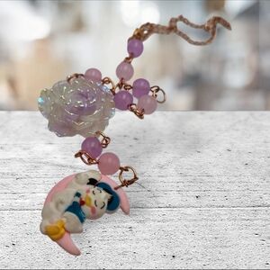Adorable car charm featuring a cartoon character on a pink crescent moon. Accented with purple beads and a shimmering flower.