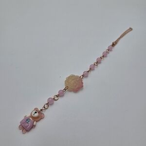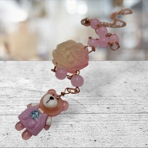 Charming car charm with a pink bear pendant and rose gold chain accents. Features a delicate floral details.