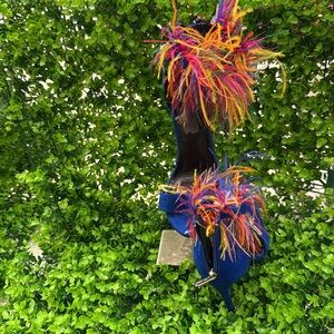 Step out in style with these vibrant blue heels featuring a stunning multicolor feather detail. Perfect for adding a pop of color to any outfit.