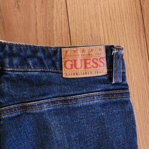 Pre-loved Vintage Guess flare jeans. Size 27, very little stretch. Color is darker denim with fading down the legs. Has front pockets but NO back pockets. Slight "baconing" in the crotch, pictured. Some wear at the back of the ankles per the style. Small stain on the waist that may be paint that might come out with a stain remover, pictured. Mid rise. RN # 62136. Cut # IQ281.