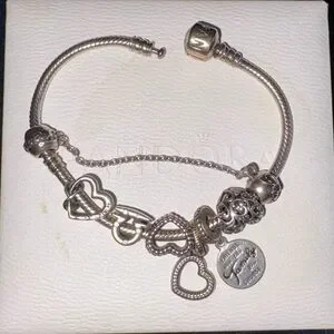 Elegant Pandora charm bracelet in silver, perfect for adding a touch of sophistication to any outfit. 6 Pandora Charms + safety chain.