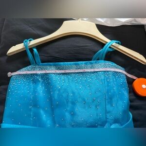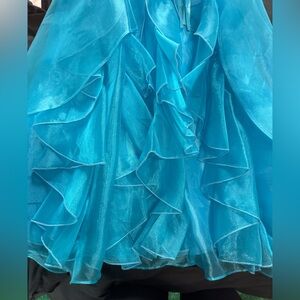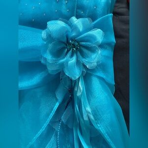 Beautiful turquoise special occasion dress by My Best Kid featuring a layered skirt and a floral accent. Comes with a matching sheer wrap.