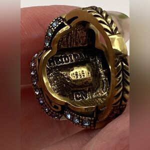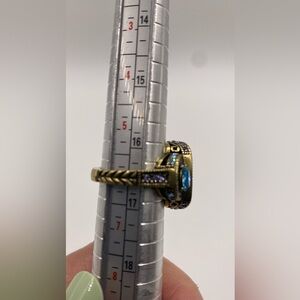This stunning ring features vibrant blue & purple crystal gemstones set in a luxurious brass tone band.