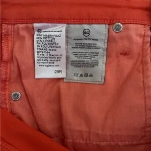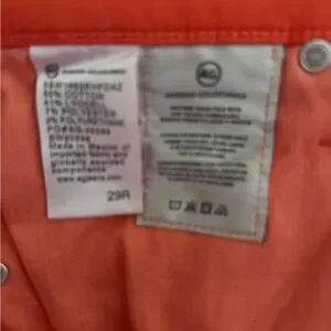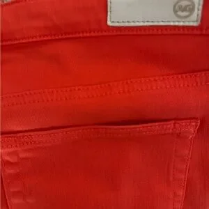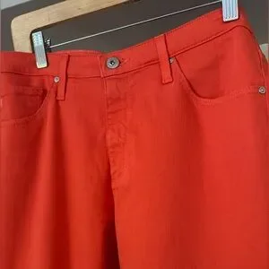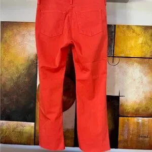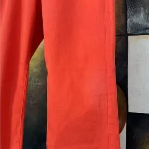 Stylish and vibrant red jeans perfect for any occasion. These jeans offer a comfortable fit and a bold look. Color is more Coral than Orange. Worn only once , never washed. Notice one small stain on knee high L leg.