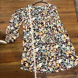Stylish floral V-neck dress with long sleeves. Features a vibrant pattern with multiple colors.