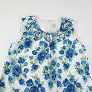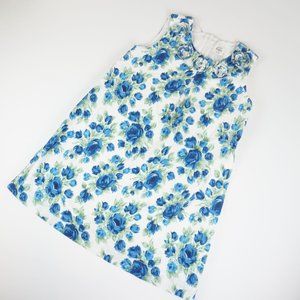 This is a sleeveless fully lined shift dress by Mini Boden in white with an all-over blue floral print with green leaves.