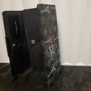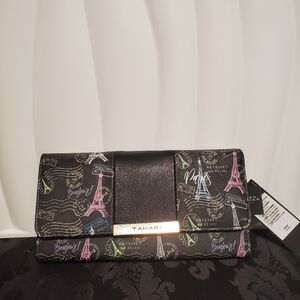 Stylish Tahari clutch featuring a chic black base with vibrant multi-color accents. Perfect for adding a pop of color to any outfit.