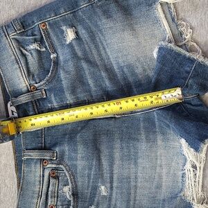 Stylish denim blue distressed shorts perfect for casual outings. Features a trendy frayed hem and classic five-pocket design.