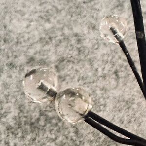 Black metal with malleable/adjustable branches. Clear acrylic balls tip each branch. Five branches at each base, of which 3 have tea light metal cups. Of the 90+ balls, there are about 4 that are more cream color vs clear, as shown. This does not distract from the overall effect to me. I have real tea lights in them for the photos, and that’s how I used them. Of course, flameless votives would be a nice, safe option.