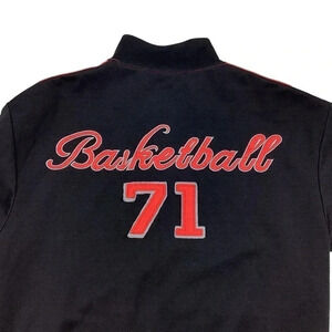 Vintage NBC Camps zip up track jacket. Late 90s early 2000s. Polyester. Full zip enclosure. Two front slide pockets. Black/red/white. Size tag is faded, measures as a large. 21 inches pit to pit, 27 inches long. No rips or tears. NBC Camps est 1971. Spokane, Washington.