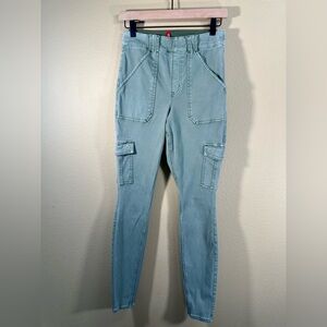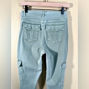Spanx's Stretch Twill Ankle Cargo Pants are known for their comfortable skinny fit and tummy-shaping design. The garment-dyed fabric gives them a worn-in look that may gradually fade with washing. To preserve the color, it's recommended to wash them inside out.