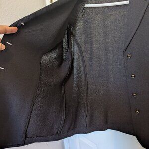 Classic knit design with four-button closure, a notched lapel collar, and attached small shoulder pads.