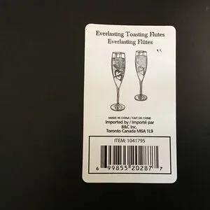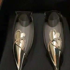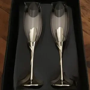 Romantic Champagne Flutes designed with 2 Crystal Hearts Embraced between Clear Glass & Silver Dipped Base