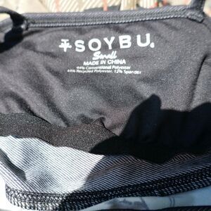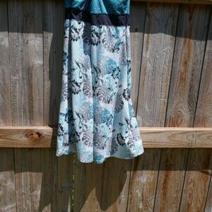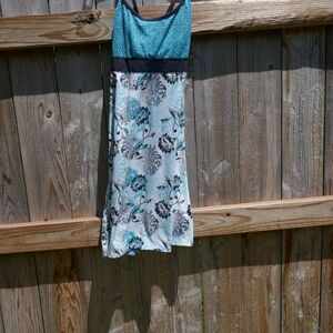 Soybu blue and white floral dress. Spaghetti straps (non-adjustable) that cross in back. Pullover. Poly blend.