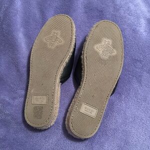 Buffed leather slip-on loafers in black. Round toe. Horsebit hardware at vamp. Leather logo patch at footbed. Shearling lining and midsole in beige. Textured rubber outsole in beige. Antiqued gold-tone hardware.